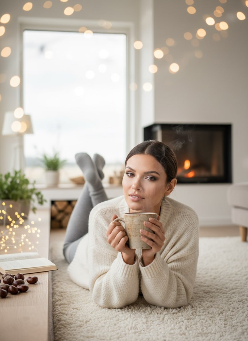 🔥 Хватит ждать идеального настроения для домашней фотосессии — создаём его за пару секунд. ⚡️ Закидываем селфи в @SnapToVideo_bot, и нейронка сама наденет на тебя лучший свитер и заварит эстетичный кофе в самом уютном интерьере. 🌚 Используя загруженное селфи в качестве точного эталона лица со 100-процентным совпадением (--face_fidelity 1.0), создайте фотографию по описанию, сохранив полное сходство с оригиналом. Уютный [кинематографичный домашний портрет] женщины в [светлой гостиной у панорамного окна]. Она [сидит на широком подоконнике, уютно поджав ноги под плед]. Одета в [объемный кашемировый свитер крупной вязки молочного цвета и мягкие серые шерстяные гольфы]. В руках [большая керамическая кружка, от которой идет легкий пар]. [Мягкое естественное освещение пасмурного дня] дополняется [теплыми бликами от гирлянды на заднем плане]. Рядом на подоконнике [лежит раскрытая книга и пара каштанов]. Атмосфера спокойствия и эстетики hygge, фотореалистично, 8k, малая глубина резкости, об