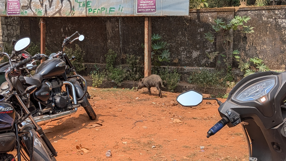 Первое, что мы увидели в Гокарне - это черные свиньи, преспокойно разгуливающие по парковке среди байков.
