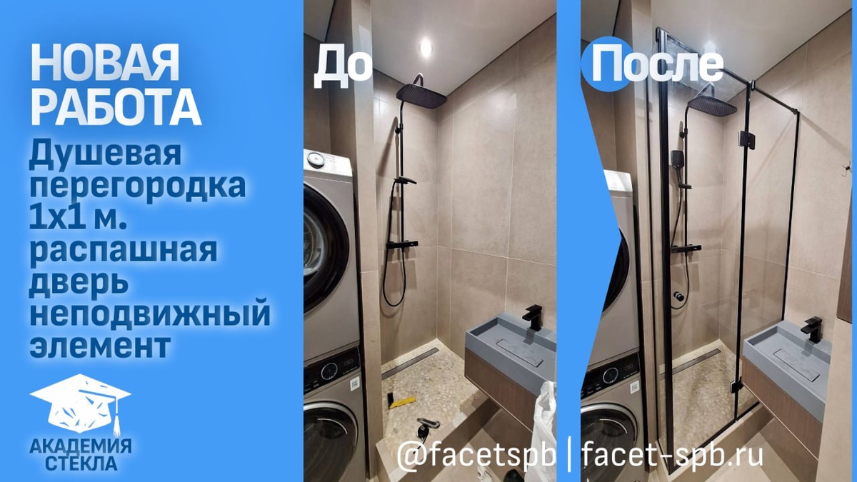 Стеклянная душевая - отличное решение. Показываем свежий объект, который доказывает: даже на скромных метрах можно сделать красиво, надежно и без луж. Под душевую зону отведена ниша 1×1 метр. Типичная ситуация для компактных санузлов, особенно в новых новостройках. 🎓 Что сделали: ✅ Безопасно. Использовали закаленное стекло 8 мм. Для семьи с детьми или просто для спокойствия — важный аргумент. ✅ Не протекает. Правильный монтаж и герметичные стыки — никаких луж на полу после душа. Никаких шторок, которые липнут к телу и собирают плесень. ✅ Красиво. Подобрали черную фурнитуру в тон уже купленным клиентом смесителю и лейке душа. В результате вся ванная выглядит как единый дизайнерский проект, а не набор случайных деталей. ✅ Стильно и легко. Прозрачное стекло не перегружает пространство, не «съедает» свет. Визуально кажется, что стены раздвигаются, а не сжимают. 🎓 Важный нюанс, который виден на фото: 🔷 Неподвижная часть перегородки имеет глубину, равную глубине раковины. 🔷 Ши