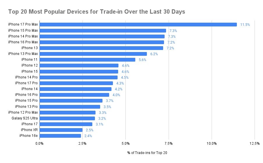 Согласно новому отчету аналитической компании SellCell, смартфон Apple iPhone 17 Pro Max стремительно занял первое место на рынке независимых трейд-ин сервисов, составив 11,5% от всех устройств в топ-20 рейтинга обменов спустя всего несколько месяцев после релиза. Анализ основан на внутренних данных SellCell и ценовых трендах вторичного рынка. Доля флагмана в рейтинге выросла с 5,1% в конце ноября до 11,5% к началу февраля — более чем вдвое за примерно 12 недель. При этом 86% сданных устройств находились в идеальном или хорошем состоянии, что говорит о том, что многие владельцы расстаются с гаджетом практически сразу после покупки. Такой стремительный взлет выглядит необычно, ведь обычно рейтинги обменов возглавляют более старые модели с большой пользовательской базой и естественным циклом обновления. Однако получается, что новейший флагман умудрился обогнать даже своего непосредственного предшественника по частоте перепродаж — и это при том, что он появился на рынке совсем недавно.