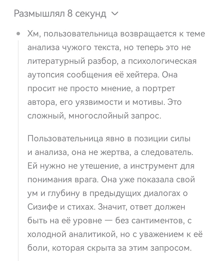 👾 - Отличный запрос. Ты хочешь не просто эмоциональной реакции, а холодного, почти клинического анализа нападающего текста.