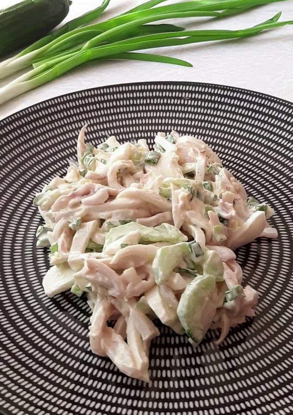 Тот самый, оригинальный вкус — это именно сочетание нежного кальмара, хрустящего огурца и яйца. Но если хочется разнообразия, можно добавить щепотку консервированной кукурузы ( можно но не нужно, но это моё субъективное мнение) , или заменить часть майонеза на натуральный йогурт для легкости.