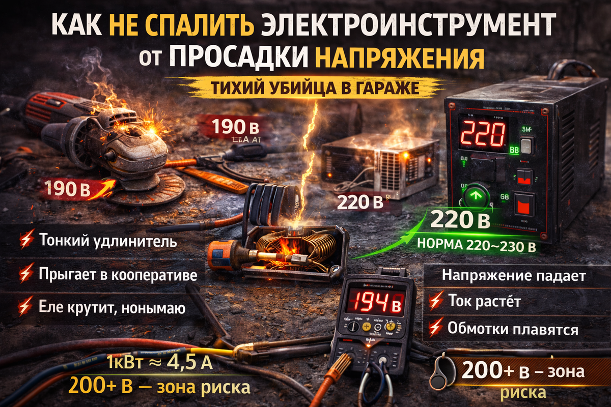 Болгарка не тянет, сварка «чихает», компрессор долго набирает. Многие думают: «Да ладно, работает же». А потом запах, дым и ремонт якоря. Просадка напряжения — это не миф. Это реальный способ угробить инструмент без короткого замыкания. Разберём, что происходит и как не попасть. Большинство электроинструмента рассчитано на 220–230 В. Когда в сети 180–190 В, мотору не хватает напряжения. Что происходит: Меньше напряжение — больше ток, чтобы сохранить мощность. Именно из-за этого инструмент перегревается. 0,75 мм² на 20–30 метров — классика. Он «съедает» часть напряжения. В розетке 210 В, на инструменте уже 185 В. Зимой, вечером, когда все включили обогреватели — напряжение падает. Инструменту тяжело, а вы продолжаете давить. Если болгарка еле крутит — это уже сигнал. Продолжать работать — значит жарить обмотки. По привычке: