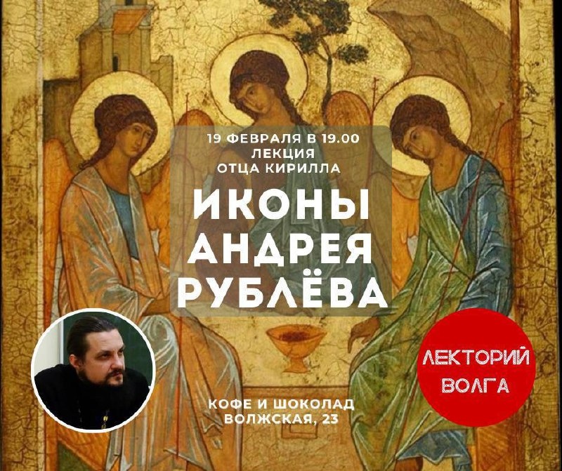 : «ИКОНЫ АНДРЕЯ РУБЛЕВА» На лекции мы познакомимся с наиболее известными работами мастера – иконами «Троица», «Звенигородский Спас», «Владимирская Богоматерь», «Преображение Господне» и «Благовещение» (авторство ряда икон, которые приписывают ему, является предметом научных споров в среде искусствоведов). 🎟️ Кто не успел приобрести билеты - можно купить по ссылке 📍 Кофе и Шоколад ул. Волжская, 23 РАСПИСАНИЕ ЛЕКТОРИЯ Лекторий "Волга" МАХ ВКонтакте