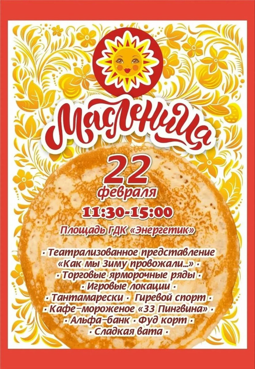 🎉21 февраля в сквере «Молодёжный» развернётся народное гуляние: театральное представление, интерактивные площадки, фотозоны, конкурсы, забавы и силовые состязания. 🎊22 февраля Масленица продолжится на площади ГДК «Энергетик». Гостей ждут театрализованное представление «Как мы зиму провожали…», ярмарочные ряды, игровые локации, гиревой спорт, кафе-мороженое, фудкорт и сладкая вата. Будет шумно, вкусно и весело. ✨В этот же день в библиотеке-музее В. П. Астафьева и на площадках рядом пройдут викторины, игры, угощения и тёплая масленичная атмосфера. Смотрите афишу и приходите всей семьей!❤️ Источник: ГДК "Энергетик" #ОгниЕнисея #Дивногорск #Масленица