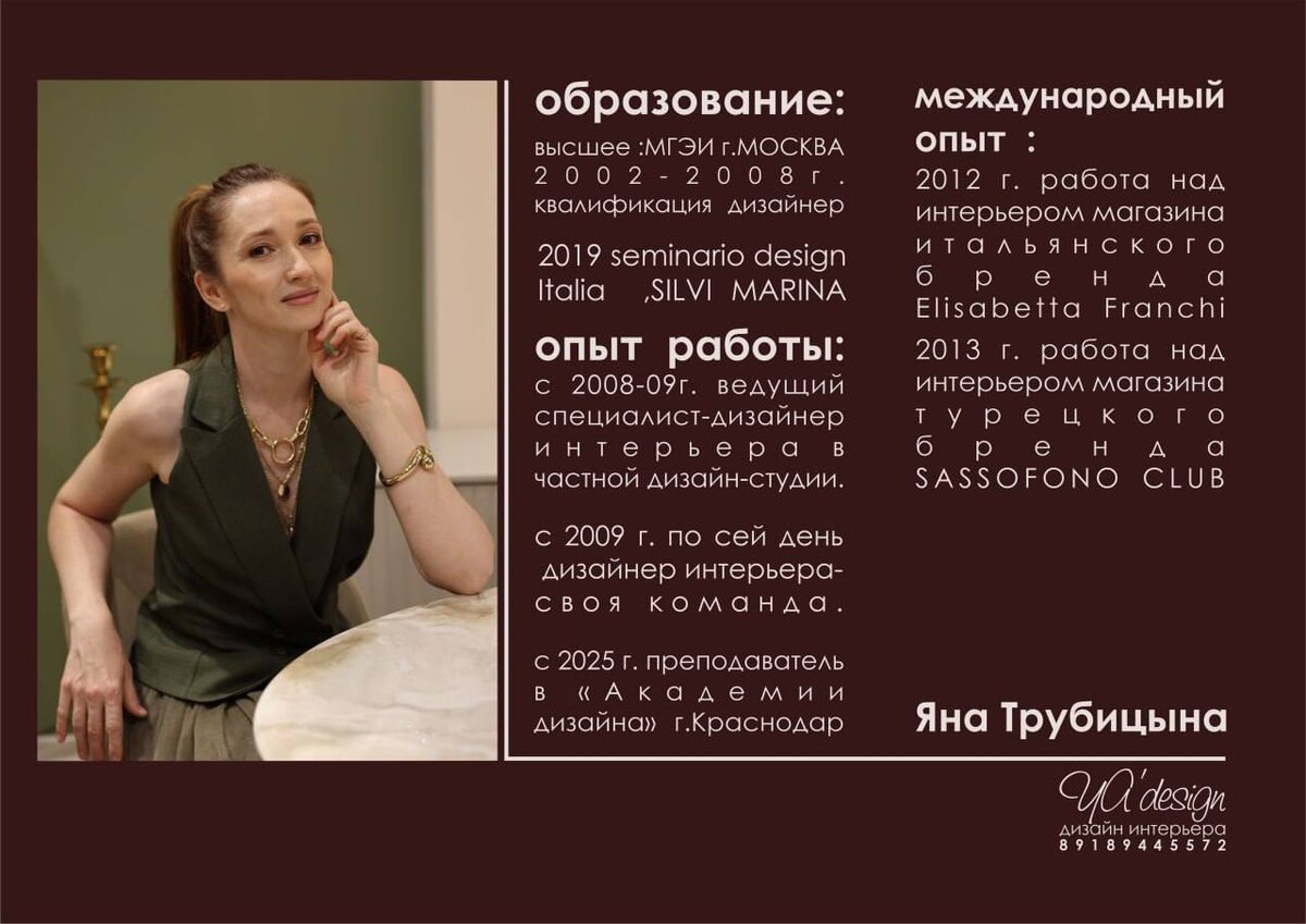 : Всем привет 🤝🏻 Меня зовут Яна Трубицына, я ведущий дизаинер и основатель проекта Ya’design С 2008 года мы с моей командой работаем в формате онлайн/офлайн и помогаем нашим заказчикам воплотить в жизнь их мечты о красивом, функциональном и уютном пространстве. Иметь красивое и функциональное пространство это возможно 🙌🏻 Я всегда готова к диалогу с Вами Если у Вас есть вопросы - пишите в комментариях и я каждому отвечу. Также вы можете писать нам в социальные сети : https://t.me/myfavoritedesign 📱 https://vk.com/yanatrubitcina 📍 https://pin.it/5dqLUlr3p Так же можно перейти на одностраничный сайт : https://yaroombe.ru/contractors/33