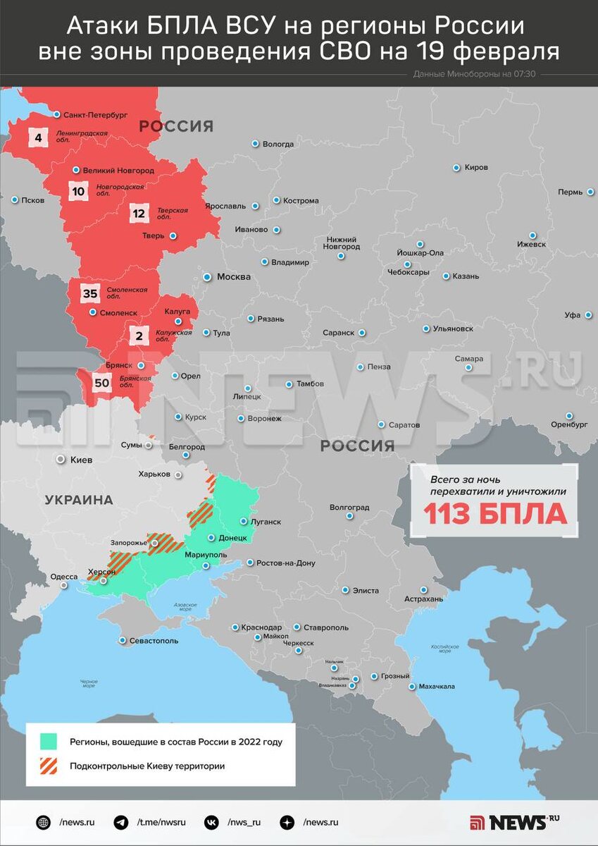50 БПЛА уничтожили над Брянской областью, 35 — над Смоленской, 12 — над Тверской, 10 — над Новгородской, 4 — над Ленинградской и 2 — над Калужской. ⭕️ Подписаться | Мы в MAX | Буст