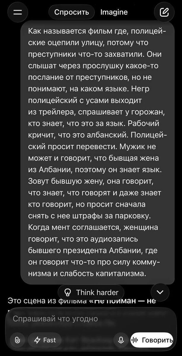 Наверное, вы сталкивались с таким богомерзким явлением, когда видишь в YouTube-shorts прикольный отрывок из какого-то фильма, заинтересовываешься, лезешь в коменты, а там… Ссылка на телеграм и подпись: «Чтобы узнать название фильма, перейди в бота и введи КОД 6357». Пусть будут прокляты те, кто это придумал. Мне кажется, в детстве они любили мучить котят. Но хорошая новость в том, что, благодаря LLM, теперь это можно обойти. Откройте Grok, напишите чат-боту, что происходило в видеоотрывке и попросите скинуть название фильма. Проверено неоднократно — работает. Возможно, с другими LLM тоже прокатит, но для поиска актуальной информации я предпочитаю Grok — он в этом лучше всех (хотя во всем остальном сосет).
