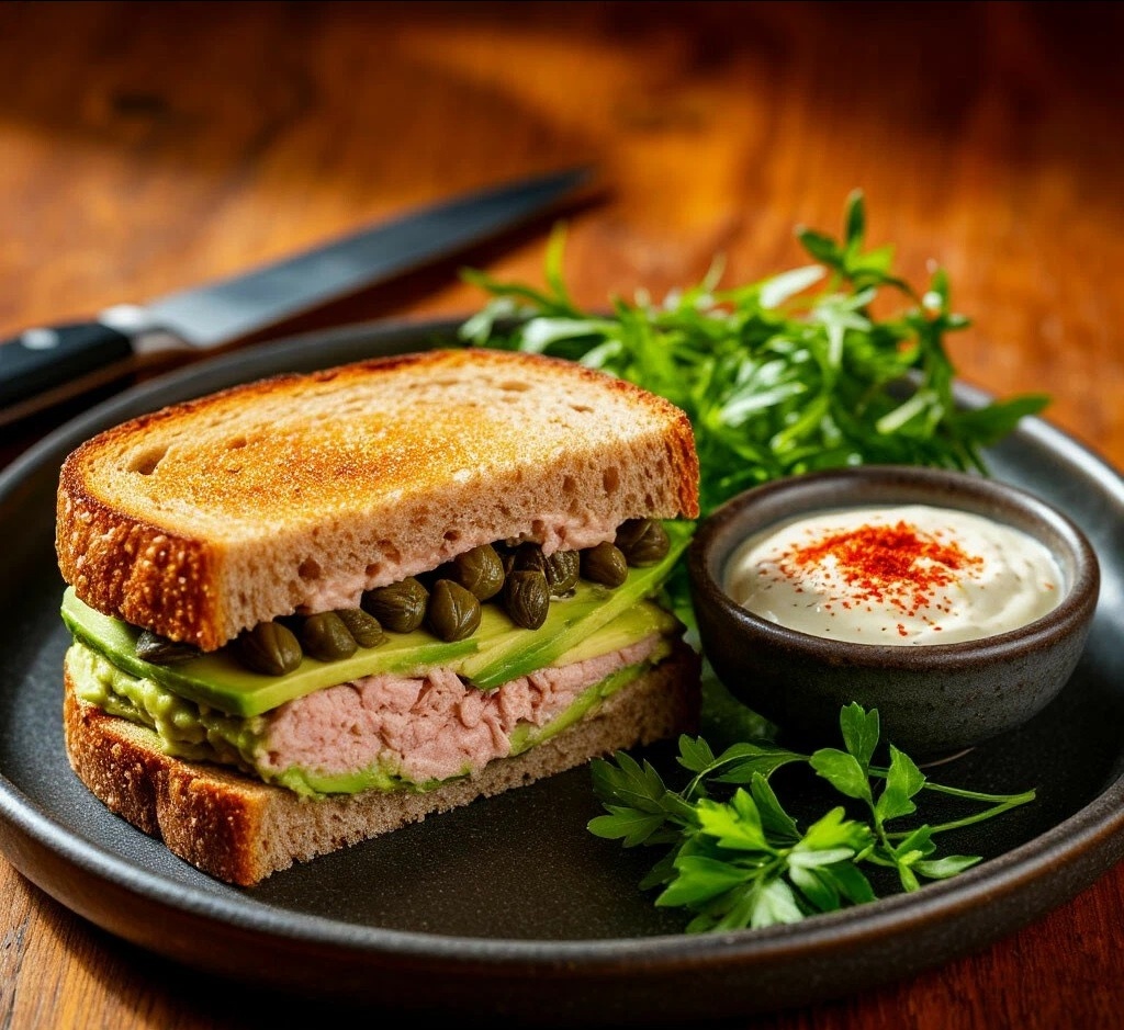 ПОЧЕМУ ЭТО ШЕДЕВР? 🎨 Этозавтрак для умных! Домашний майонез готовится за минуту и в сто раз вкуснее магазинного. Тунец даёт белок и омегу-3, авокадо — полезные жиры и кремовость. А каперсы добавляют ту самую пикантную нотку, которая делает простой сэндвич ресторанным блюдом. 🏆