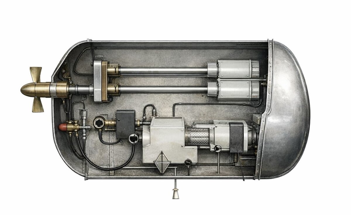 Инженер Николай Кириллов представил собственную схему новой ракетной подводной лодки с комбинированной энергетической установкой. Разработка нацелена на повышение эффективности хода, ресурса двигателей и управляемости лодки как на поверхности, так и под водой. Решение объединяет дизельный маршевый привод и вспомогательную атомную систему малой мощности, патент уже зарегистрировали в базе данных ФИПС. Разработка нацелена на повышение эффективности хода, ресурса двигателей и управляемости лодки как на поверхности, так и под водой. Согласно задумке, маршевый режим обеспечивает гребной вал с винтом фиксированного шага, связанный через редуктор и муфты с дизельными двигателями. Это позволяет держать моторы в оптимальном режиме и снижать износ. Для экономичного подводного хода используется отдельный вал с электродвигателем и винтом регулируемого шага, питаемым от аккумуляторов. Ключевой элемент — двухконтурная вспомогательная атомная установка с водоохлаждаемым реактором низкого давления и о