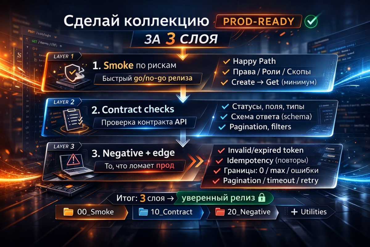 Если коллекция у тебя это "просто запросы", обычно через пару спринтов получается свалка: дубли, непонятные названия, случайные проверки и вечный вопрос "а что вообще прогонять?". Я предпочитаю держать порядок, поэтому на проекте всегда структурирую Postman-коллекции. Пример подхода (как ориентир, не догма): 1) Коллекция “OpenAPI” Одна коллекция соответствует актуальной OpenAPI спецификации проекта. Это база, чтобы видеть как оно сейчас на проде реализовано. 2) Коллекция “Functional (core)” Декомпозирована по функциональности: без лишних запросов, только то, что реально нужно в работе (самые частые операции, критичные флоу, опорные эндпоинты). 3) Коллекция “Smoke / E2E” Ключевые e2e-сценарии + проверки. Быстро понять: можно ли безопасно продолжать работу, не горит ли критичное. 4) Коллекция “Contract checks” Контрактные проверки: обязательные поля, типы, enum, форматы, мета (включая пагинацию). Это защита от "под шумок сломали контракт". 5) Коллекция “Negative / Edge” Сценарии,