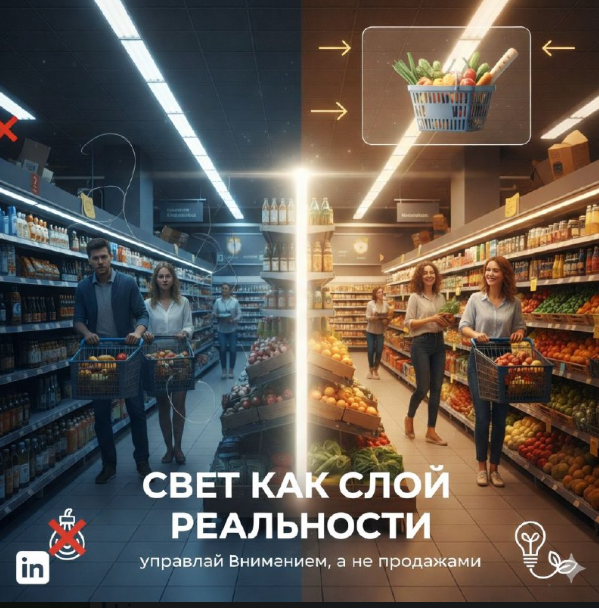Свет как Слой Реальности: Инструкция для Маркетинг-Директора по Управлению Вниманием Покупателя В мире ритейла борьба идет не за кошелек, а за энергию внимания. Большинство сетей совершают классическую ошибку: они пытаются «заставить» покупателя купить товар. В Трансерфинге это называется работой на внутреннем намерении. Но есть другой путь — создать в супермаркете такую «амальгаму» (атмосферу), в которой покупка становится естественным и единственным выбором. 1. Провал маятника «Экономия любой ценой» Маркетинг-директор часто находится под гнетом маятника «бюджетной эффективности». Он видит в освещении лишь статью расходов. Ваша задача — показать, что плохое освещение создает «избыточный потенциал» напряжения у покупателя. В тусклом или неправильно настроенном свете продукты выглядят безжизненными, а пространство — давящим. Покупатель подсознательно стремится быстрее покинуть такой слой реальности. 2. Целевой слайд: Идеальная витрина Проектирование освещения — это не расстановка ламп,