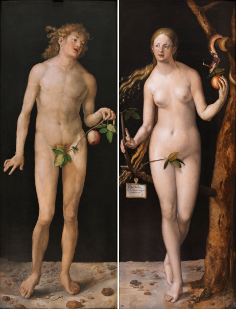 Альбрехт Дюрер (1471–1528) написал «Адама» и «Еву» по возвращении из своей второй поездки в Италию в 1505 году. Обе картины представляют собой попытку объединить полученные им знания. Художник стремился достигнуть баланса между итальянским и немецким влиянием для достижения идеального совершенства человеческого тела. И библейский сюжет является лишь предлогом для этого. Его знание классической обнажённой натуры достигало поразительного уровня, а точность рисунка раскрывает уникальный почерк гравера, выросшего в северных традициях. Растущее итальянское влияние очевидно в монументальном величии его фигур, в то время как немецкое влияние ясно прослеживается в использовании цвета, точности деталей и натуралистическом, экспрессионистском стиле, ещё больше усиленном его блестящим талантом рисовальщика. Неустойчивые позы Адама и Евы, ритмичные движения и нарочитые жесты иногда интерпретируются как возвращение к готическим образцам искусства, а не как то, чем они являются на самом деле: пр