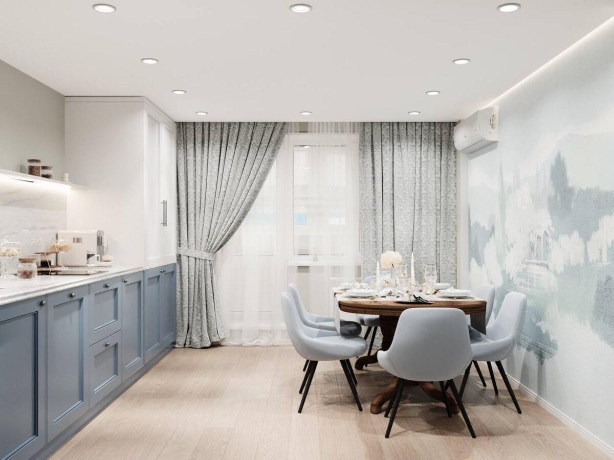 Это 2-комнатная квартира, площадью около 80 кв.метров, для семьи с двумя детьми. В кухне-гостиной расположилась просторная обеденная группа. Спальная оформлена в спокойных тонах, создающих атмосферу гармонии. Системы хранения «спрятаны» за текстилем, который соответствует стилю оформления оконных штор. В детской пространство поделили. Мы предусмотрели личное пространство для каждого –индивидуальные кровати, рабочие места и шкафы. Данный проект - пример удачного сочетания стиля и комфорта, который станет прекрасным домом для наших заказчиков.
