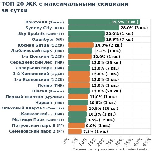 🟩 Честные скидки: 24 ЖК (255 кв.) 🟧 Маркетинг скидки: 22 ЖК (116 кв.) 💎 МАКСИМАЛЬНАЯ ЭКОНОМИЯ 🏆 ФСК • Sydney City ├🔻24.9M → 89.1M • 5-к 126м² ├🔻24.8M → 88.5M • 4-к 118м² └🔻4.5M → 25.2M • Студия 31м² 🥈 Эталон • Воксхолл ├🔻14.8M → 41.2M • 2-к 76м² └🔻9.1M → 23.1M • 1-к 42м² 🥉 Самолёт • Sky Sputnik └🔻5.8M → 29.1M • 2-к 77м² 4️⃣ Эталон • Шагал ├🔻4.1M → 40.6M • 2-к 71м² ├🔻3.8M → 31.5M • 2-к 53м² └🔻3.8M → 31.4M • 2-к 55м² 5️⃣ ПИК • Середневский лес └🔻2.5M → 21.0M • 3-к 92м² 🔑 САМЫЕ ДОСТУПНЫЕ 🏆 Гранель • Пехра ├🔻61к → 6.0M • Студия 32м² ├🔻61к → 6.0M • Студия 32м²❗️ └🔻61к → 6.0M • Студия 32м² 🥈 Самолёт • Мытищи Парк ├🔻600к → 7.0M • 1-к 32м²❗️ ├🔻628к → 7.4M • 1-к 32м²❗️ └🔻657к → 7.7M • 1-к 33м²❗️ 🥉 AFI • Одинбург ├🔻443к → 7.7M • Студия 37м² ├🔻326к → 7.8M • Студия 36м² └🔻335к → 7.8M • Студия 36м² 4️⃣ Самолёт • Космический Квартал └🔻397к → 8.0M • 1-к 36м²❗️ ❗️— лоту меньше месяца 👇 Полная статистика: 📲 В Telegram | 🌐 На MskMeter.ru