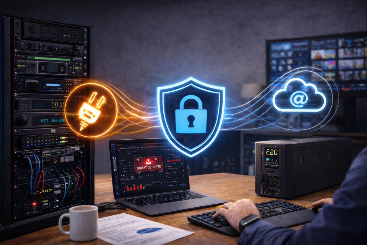 ИБП (источник бесперебойного питания) — первая линия защиты AV-инфраструктуры. Для медиасерверов и коммутаторов нужен ИБП на 1500-3000 ВА. Автономная работа 10-15 минут — достаточно для корректного завершения сессии.