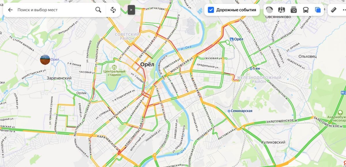 Утром 19 февраля во вторую волну снегопада и метели за неделю Орел снова встал в пробках, следует из данных онлайн-карт. Справедливости ради отметим, что на этот раз заторы слабее, чем были в понедельник. На карте почти нет бордовых участков с максимально замедленным движением. По данным онлайн-карт, серьезные пробки на ул. Комсомольской на участке от Многопрофильного колледжа ОГАУ до пересечения с улицей МОПРА. Причем на выезде с МОПРы на Комсомольскую также серьезные заторы. Кроме того, сильно замедленно движение на ул. Колхозная и Генерала Родина. Пока от пробок не освободились ул. Комсомольская, Московская, 1-я Курская, 60-летия Октября, Октябрьская, Тургеневский мост, ул. 1-я Посадская, Полесская и Карачевское шоссе. Не исключено, что орловцы прислушались к просьбе губернатора оставаться сегодня дома, в результате чего машин на дороге меньше, чем было в понедельник. Еще по теме: Мощный снегопад сковал движение в Орле