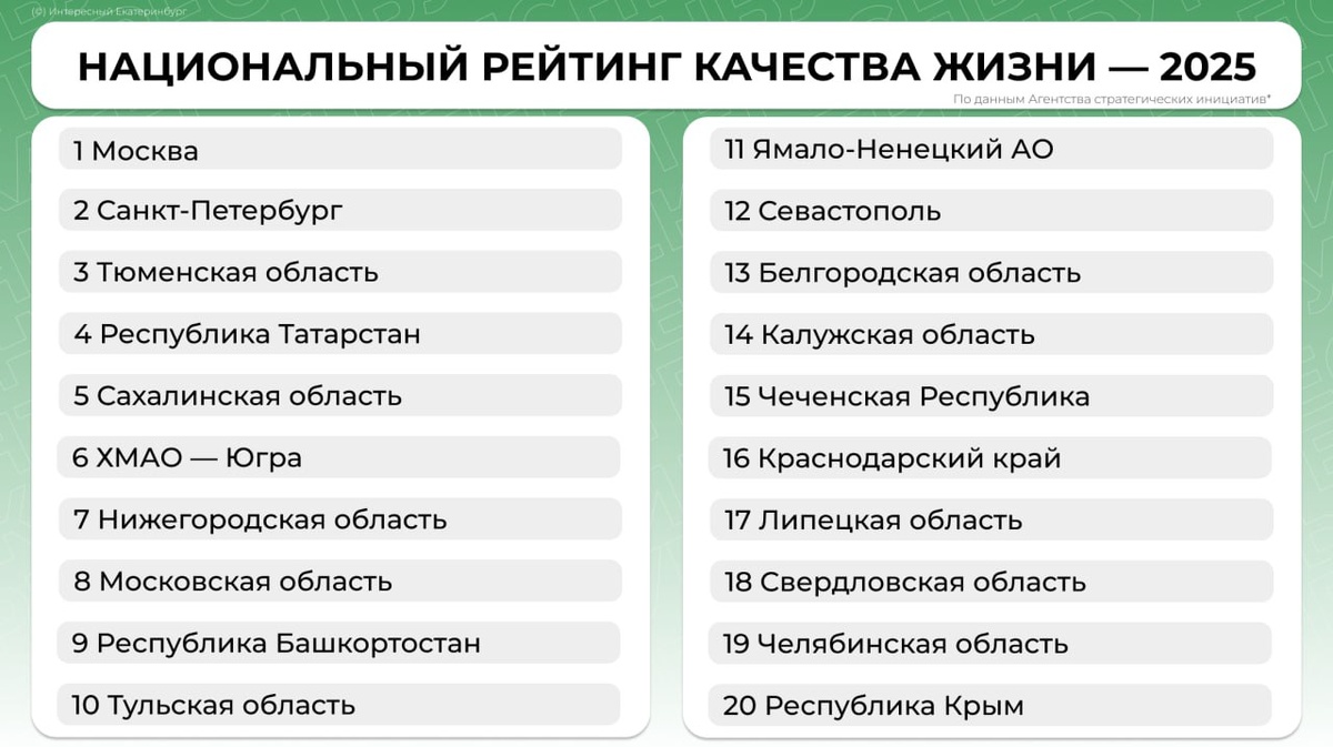 В конце рейтинга качества жизни оказалась Свердловская область