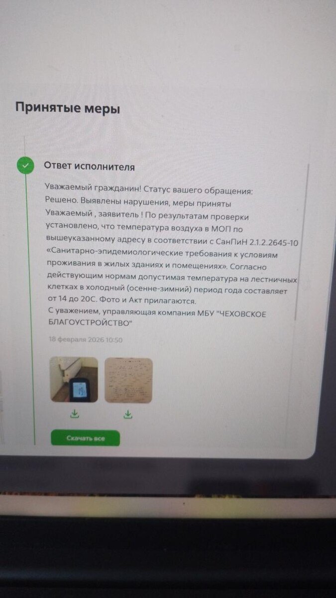 📩📤📥📨✉️ Жители Чехова: муниципальная управляющая компания “Чеховское благоустройство” продолжает врать собственникам! “Такую УК назначил нам глава (Михаил Собакин - ред.)! Собственникам дома по адресу Вишневый б-р, д. 4 А закрыли заявку на отсутствие отопления в местах общего пользования второго подъезда актом замера температуры воздуха, уверяя что она в норме и отопление работает. Как оно может работать, если ТРУБЫ И РАДИАТОРЫ СРЕЗАНЫ! ИХ НЕТ! Акт, подписанный техниками Перетошиной Е.И. и Юдиной Т.И. от 18 февраля и фото со срезанными трубами тоже от 18 февраля. Приличных слов не осталось….