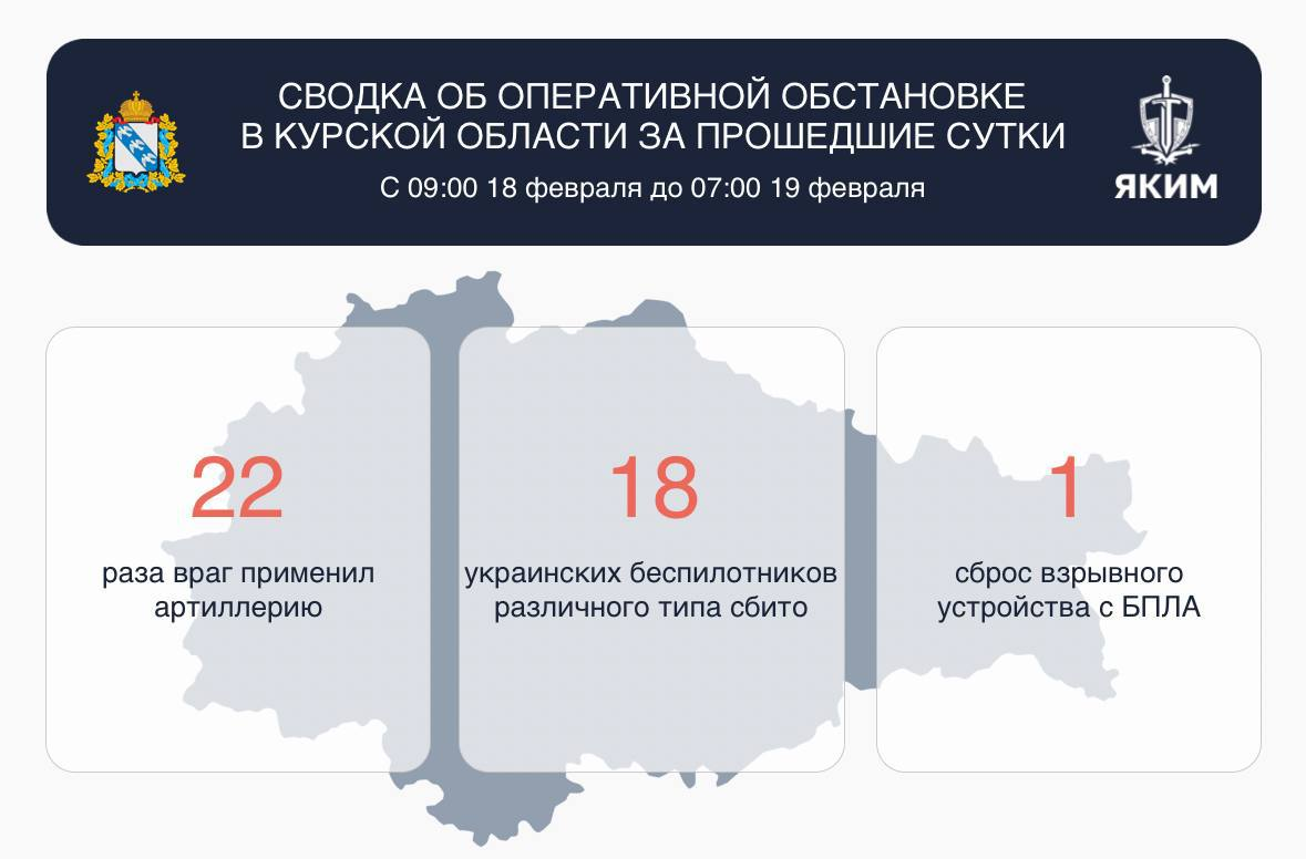 Об этом в сводке об оперативной обстановке сообщил губернатор. Всего в период с 09:00 18 февраля до 07:00 19 февраля 22 раза враг применил артиллерию по отселённым районам. 1 раз беспилотник атаковал регион с помощью сброса взрывчатки. В результате атаки в селе Калиновка Хомутовского района автомобиль получил повреждения. К счастью, погибших и пострадавших нет. 📲 Мы в Max 📱 Мы в Телеграм
