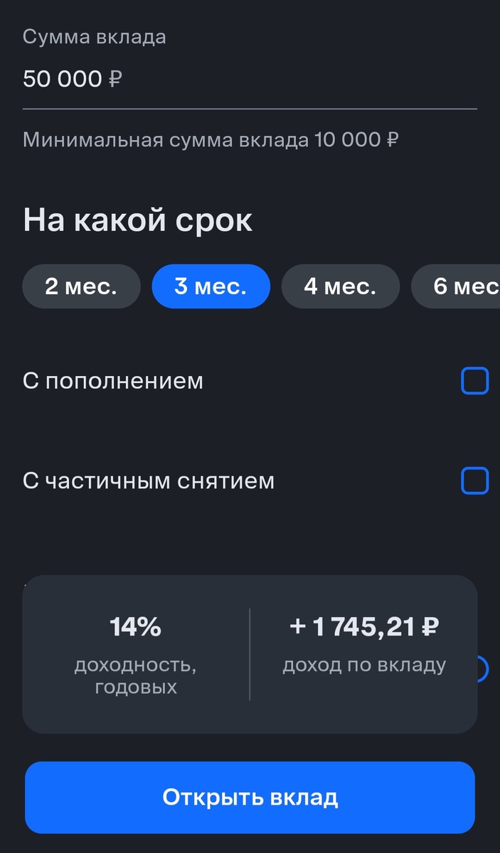 Жёлтый банк подкачал в этот раз и предлагает всего 14% годовых на 3 месяца, но тут до сих пор есть возможность зафиксировать 14,56% на 6 месяцев (эффективная ставка с учётом ежемесячной капитализации будет 15% годовых). Я уже открыл два таких вклада с возможностью пополнения в первый месяц. Для меня это хорошее предложение и возможность зафиксировать ставку на целых 6 месяцев, но сейчас мы ищем другие вклады, идём дальше.