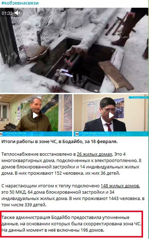Количество пострадавших от отключений тепла и воды в Бодайбо Иркутской области резко выросло. Об этом только к концу третьей недели сообщил губернатор Игорь Кобзев («Единая Россия»). «Администрация Бодайбо предоставила уточненные данные, на основании которых была скорректирована зона ЧС. На данный момент в неё включены 196 домов», — сказано в телеграм-канале Кобзева. Ранее власти объявляли, что в зоне отключений из-за аварии 30 января оказался 141 дом, в котором проживают более 1,3 тыс. человек. А теперь в свежем отчёте Кобзева об аварии сказано, что тепло каким-то образом «вернули в 148 жилых домов», где проживают уже более 1,44 тыс. человек. 📌 При этом Кобзев обещал, что теплоснабжение полностью восстановят до 21 февраля. После аварии возбуждено дело об оказании небезопасных услуг (ст. 238 УК). Подписаться| Прислать новость| Помочь бустами