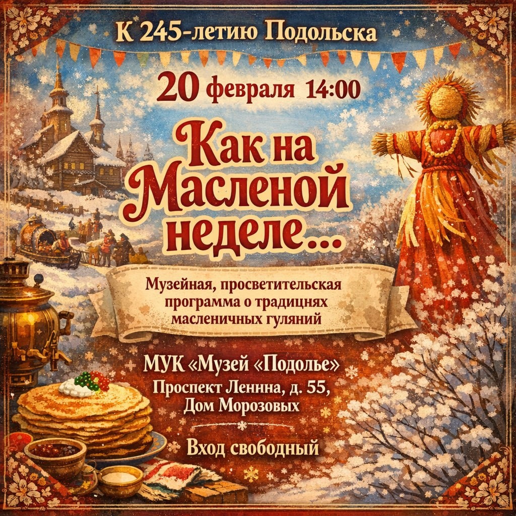 ✨ Масленица в «Подолье»! 🔔 Вы узнаете, как отмечали Масленицу, какие обычаи соблюдали наши предки и какие традиции сохранились до наших дней. 🎶 Особое настроение создаст фольклорный ансамбль «Житница» Детской школы искусств «Моя Русь» — живое исполнение народных песен подарит настоящее праздничное звучание! 🚫 Возраст: 0+ 📆 20.02.2026 🕒 14:00 🏢 Музей-заповедник «Подолье» - Дом Морозовых 📍 г. Подольск, пр-т Ленина, д.55 💰 Вход свободный❗️ ⭐Поддержать канал голосом 🍰Где поесть в Подольске ✅ Мероприятия Подольск https://dzen.ru/id/66ed500f7b5671493eca3fd6 http://vk.com/podolsk_events http://dzen.ru/podolsk_events