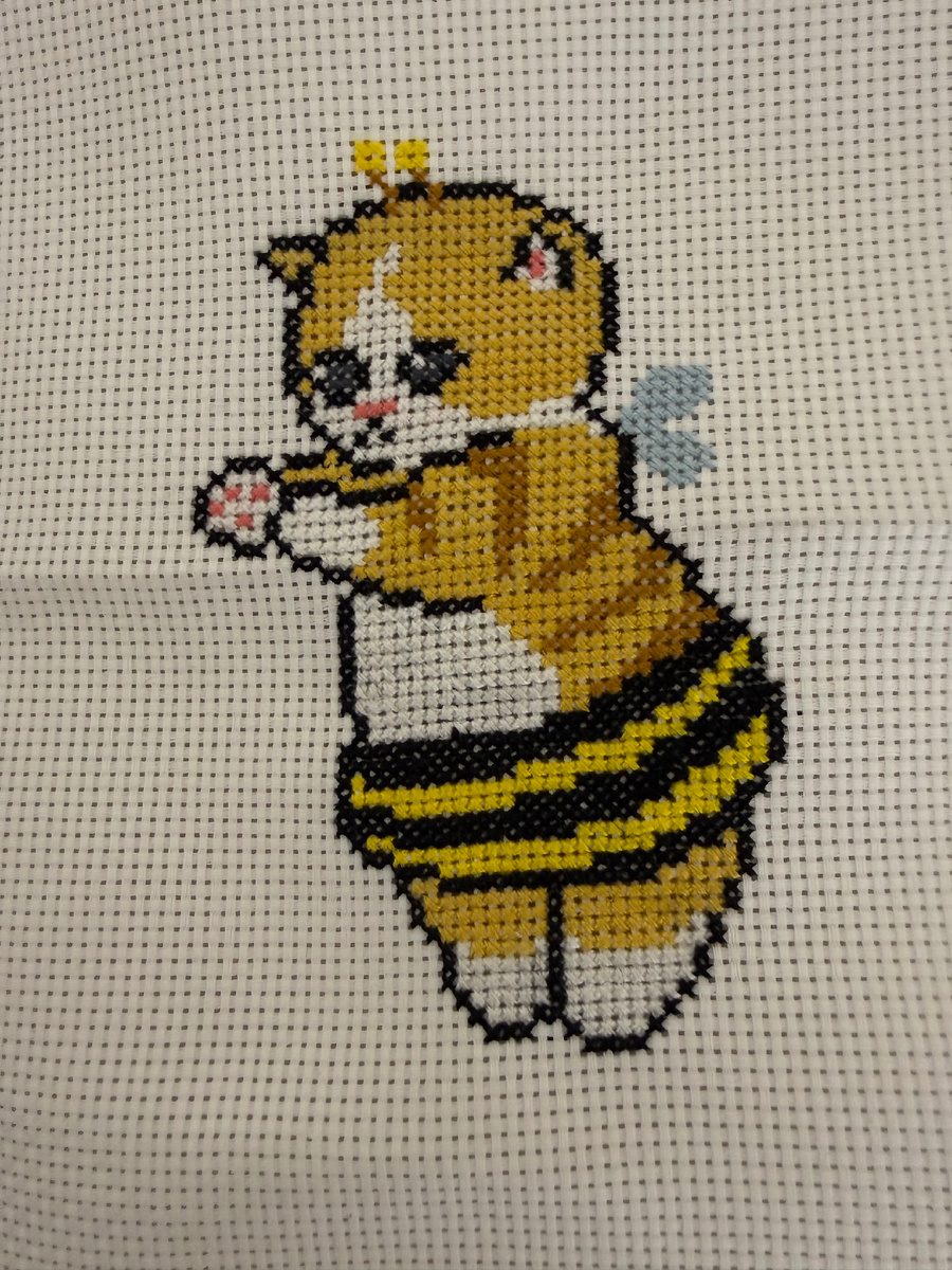 Эта забавная вышивка у меня появилась случайно. Набор оказался милым сюжетом с котиком, наряженным в костюм пчелы. На сайте ВБ этот набор стоил какие то копейки и конечно же я его купила. Планировала его вышивать как дорожный процесс. Ну собственно так и получилось. Вышивала