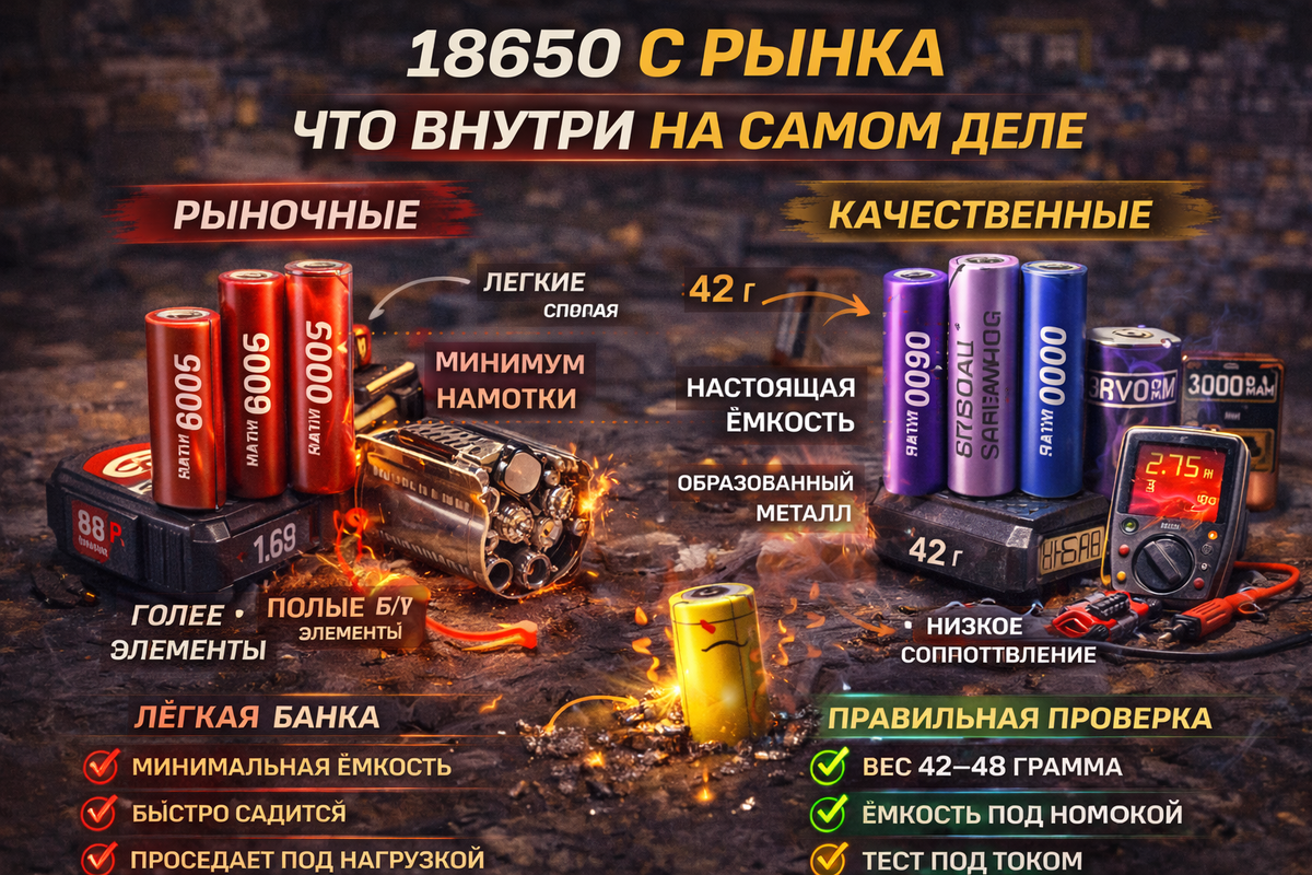 Внутри — разная химия, разная намотка и разный ресурс. Если понимать, что искать, разочарований будет меньше. Внутри 18650: Чем больше активного материала — тем выше реальная ёмкость. Чем качественнее химия — тем лучше держит ток. Если внутри мало намотки — банка лёгкая и слабая. Физика простая: меньше металла и химии — меньше ампер-часов. Я находил: Иногда это просто б/у из ноутбуков. Если написано 9900 мАч — это почти всегда фантазия. Реальный предел для 18650 — примерно 2500–3500 мАч (в зависимости от типа). Нормальная 18650 весит примерно 42–48 грамм. Если вес 28–32 г — внутри почти пусто. Без нагрузки показывает 4.2 В — кажется норм. Под 5–10 А проседает до 3 В — и всё. По привычке: Как делаю я: Если не проходит тест —