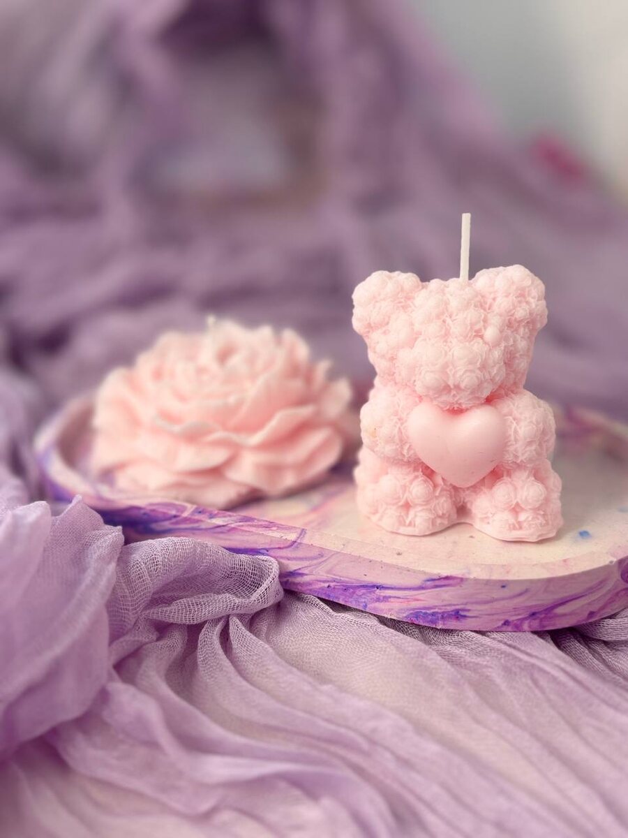 "» Две свечи с ароматом розы и пиона в одной коробке. Для самой трогательной девушки в вашей жизни. 🎁 Свеча «Мишка» Свеча «Роза» 🍯 Форма Милый медвежонок из воска — трогательный, уютный, с детской непосредственностью Изысканный бутон розы — нежный, женственный, с проработанными лепестками 🌸 Аромат Роза и пион — нежный цветочный дуэт в каждой свече Роза и пион — тот же бархатистый букет, объединяющий обе свечи