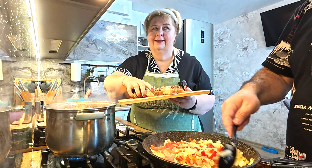 Всем доброго утра и хорошего дня!!!! Поехали... Парни уехали, но уже едут назад. У них партзадание-купить мелконького лука для идеи фикс Олы Кочуры. Ола ведёт репортаж из своей спальни. "Вчера, считайте, погода была +4, сегодня уже -10. Из крайности в крайность"-бедует Кочура, заливая себя порцией парфюма. У неё побаливает голова и пол скрипит. Надо его перебирать, но худеть Олушке не надо. Кочура уже поставила костомахи на бульон для любимого мужа. Завтра у Сафара начинается пост и ему можно будет есть "ночью, в 5-6 утра". Нужна сытная еда и Олушка варит мужской суп. Сафар будет держать пост месяц и по первости стаёт нервным. Надо терпеть-пить, есть, курить нельзя. А быть дрянью в душЕ можно? Толку от такого поста, если человек не может справиться со своими пороками -злостью и ненавистью, неодолимой тягой к жратве? " Ему надо чуть-чуть схуднуть"-резюмировала Ола. Здесь я посмеялась от души, она просто сделала мой день одной фразой. Начались воспоминания, когда кошка Мила застряла у ни