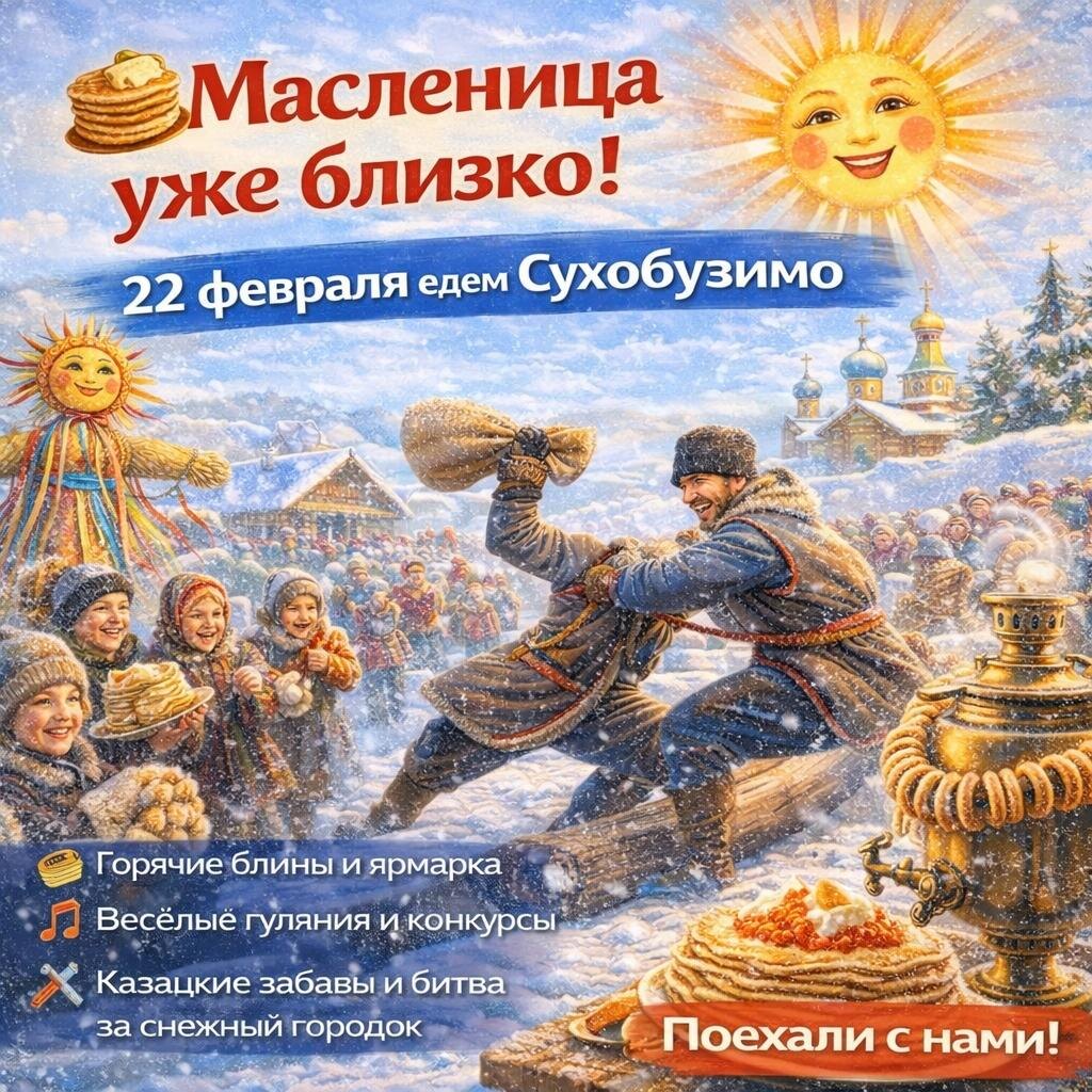 ! 22 февраля едем в Сухобузимо Хочется выбраться из города, сменить обстановку и поймать настоящее праздничное настроение? Тогда поехали с нами на Масленицу в Сухобузимо — один из самых ярких зимних праздников края. 🎉 Что вас ждёт: 🥞 Горячие блины и ярмарка 🎶 Народные гуляния, конкурсы и весёлые забавы ⚔ Казачьи выступления и битва за снежный городок — главное событие дня Гуляем, фотографируемся, участвуем в забавах или просто наслаждаемся атмосферой — каждый найдёт формат по душе. 🚌 Как проходит поездка: ✔ Трансфер из Красноярска и обратно ✔ Сопровождение и экскурсионный рассказ в дороге ✔ Свободное время на празднике ✔ Организация от лицензированного туроператора 📅 Детали: 🗓 22 февраля 2026 (воскресенье) ⏰ 11:00 – 17:00 🚍 В пути — около 1–1,5 часов 💰 Стоимость: • 1700 ₽ — взрослый • 1600 ₽ — льготный (дети 3–12 лет, пенсионеры) ✨ Масленица — отличный повод провести день ярко, весело и с пользой. 📩 Пишите в личные сообщения группы — подскажем и запишем. Количеств