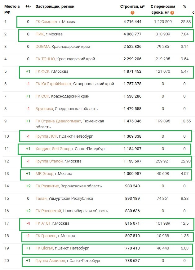 ? Ситуацией с ГК Самолет навеяно, прилетел вопрос, как самому понять, что у того или иного застройщика проблемы. Однозначного ответа нет. Надо быть в контексте рынка. Тем не менее, в качестве первого шага, я бы обратил внимание на рейтинг Единого Ресурса Застройщиков. Смотреть его лучше в динамике ( он обновляется 1 раз в месяц). Смотрите, как меняется % объектов, которые строятся с задержкой ( в этом смысле даже по рейтингу было понятно что с 01.04.2025 у ГК Самолет проблемы). Все застройщики, которые строят более 10% объектов с переносом сроков, требуют, как минимум, дополнительного внимания ( причины все таки могут быть разными). На картинке - ТОП 20 застройщиков по объему строительства. Питер и Москву я выделил зеленым. *** #застройщики #рынок #рейтинг #гксамолет Контакты для связи здесь. @about_estate
