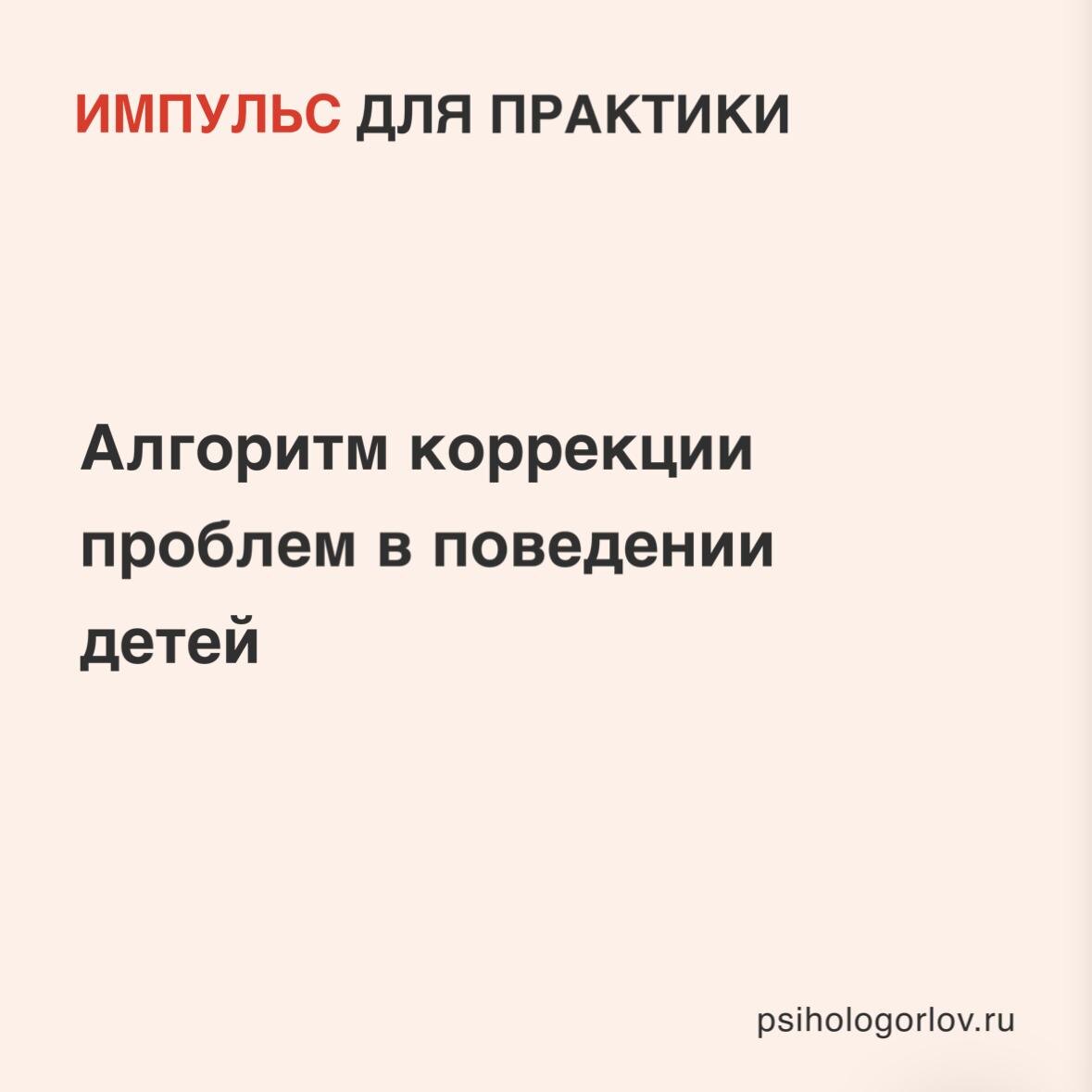 ». 🔹 Алгоритм из 10 шагов для использования в практике уже опубликован на сайте: https://psihologorlov.ru/p/korrekciya-povedeniya-u-detej-algoritm-dlya-specialistov 💡 Будет полезно психологам, которые хотят структурировать подход к коррекции проблемного поведения у детей. #импульсдляпрактики 💬 Записаться на консультацию или супервизию: www.psihologorlov.ru 🤖 Трудно сформулировать запрос? ПервыйКонтакт🤝 — бот-помощник для подготовки запроса к психологу: https://t.me/InitialContactBot