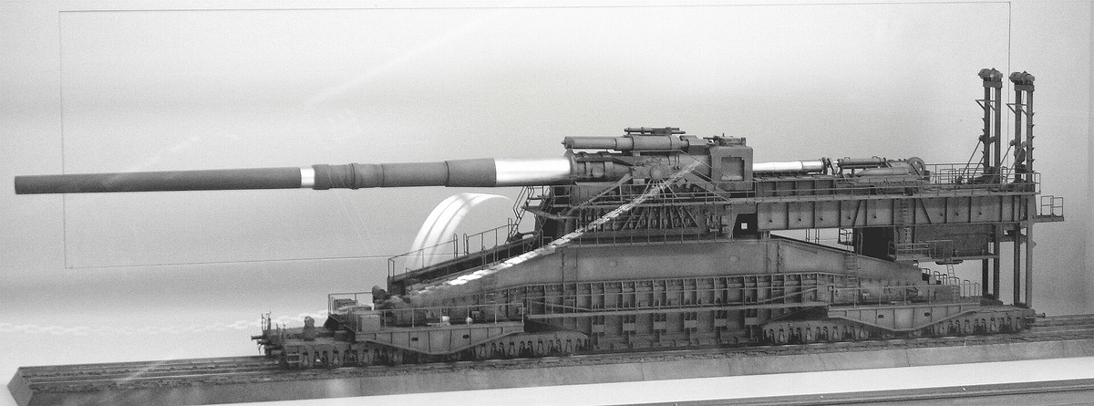 Представьте себе стальной собор. Только возведен он не во славу Господа, а для того, чтобы швырять семь тонн спрессованной ненависти за горизонт. «Шверен Густав» (Schwerer Gustav) — это не просто пушка. Это кульминация инженерного безумия Третьего рейха, памятник тому моменту истории, когда тактика окончательно уступила место театральности. «Шверер Густав» (черный) в сравнении с пусковой установкой ОТР-21 «Точка-У» БРСД (красная) (которая запускает снаряды аналогичного размера и дальности действия) с человеческими фигурами в масштабе для сравнения Когда в документах концерна Круппа впервые замелькали чертежи 800-миллиметрового орудия, мир еще мыслил категориями Первой мировой. Генералы грезили о сокрушении линии Мажино, полагая, что бетон можно победить только еще большим количеством стали. Густав родился из этого страха перед позиционным тупиком. Снаряды орудия должны были пробивать семь метров железобетона или один метр стальной брони на расстоянии, недоступном для французской артилл