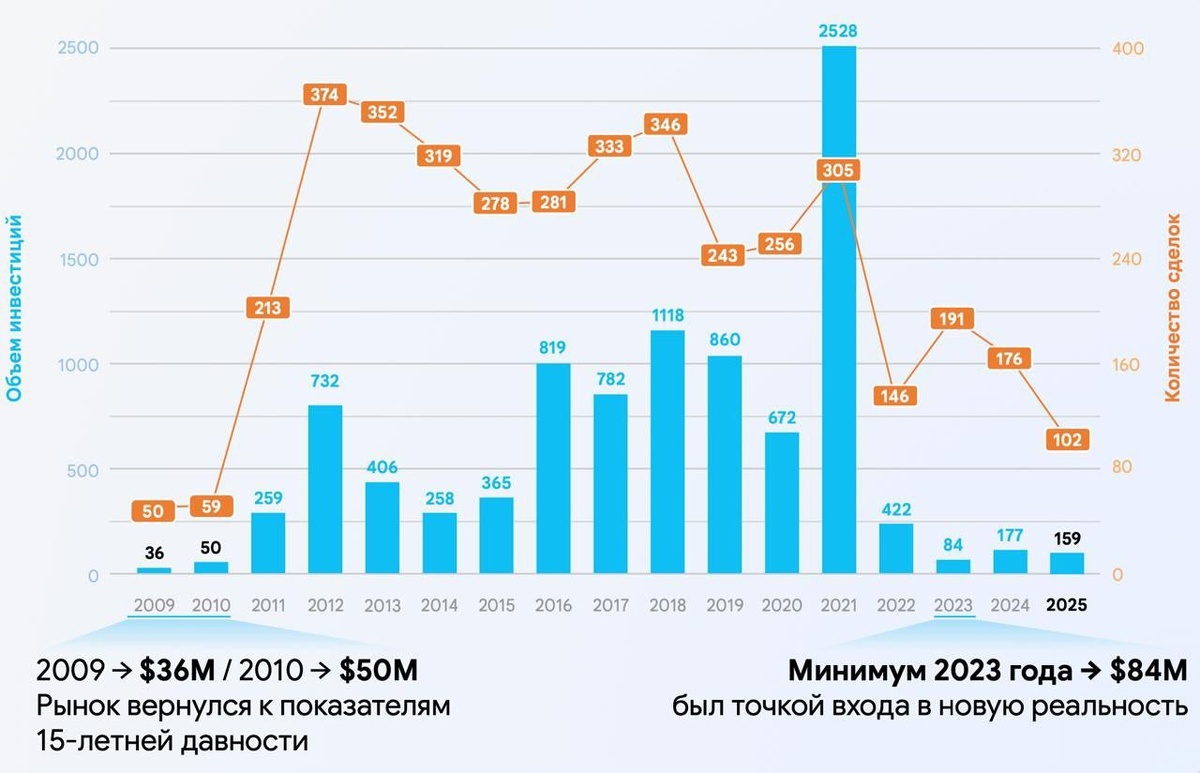 Согласно исследованию Dsight, объём венчурных инвестиций сократился на 10% - до $159 млн. Количество сделок обвалилось на 42% - до 102 против 176 годом ранее. 💡. Какие я вижу выводы для фаундеров: 1️⃣ Кто решает реальные проблемы своих клиентов - тот и находит инвестиции. 2️⃣ Чем больше продукты vibecодятся и копируются, тем важнее становится умение их продвигать. Даю пример: Индийская команда недавно выложила в открытый доступ open source-аналог американского SaaS сервиса ("оригинал" привлек около $80–90 млн венчурных инвестиций): генерация лендингов на ИИ, нормальный UX, быстрое копирование core-функций без бренда и маркетинга. 3️⃣ ИИ не «продаётся» напрямую - его ценность постепенно доказывается в процессах клиентов. 4️⃣ SaaS в России фактически нет - из-за структуры экономики, где доминируют корпорации, предпочитающие on-premise-решения. 5️⃣ B2C мёртв, особенно для продуктов с маленькими чеками. Мы продолжаем инвестировать там, где ожидаются больше иксов - в долине доширак