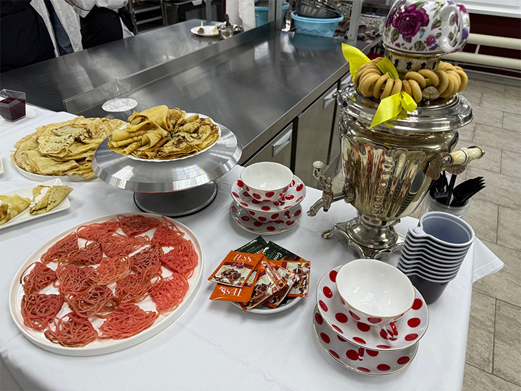 В Апатитском политехническом колледже есть традиция: каждый год на Масленицу студенты первых-вторых курсов пекут необычные блины и угощают преподавателей. Подача выглядит непривычно: блины не просто разноцветные, но ещё и кружевные. Чтобы их приготовить, нужен кондитерский мешок и чуть более густое тесто, чем для обычных блинчиков. Цвет тесту придают натуральные красители: свежевыжатый сок свёклы, шпината, моркови. Половину блюд приготовили трое студентов второго курса — Сергей Шульга, Дарья Лимонова и Ульяна Сорич. Ранее девушки побеждали в региональном этапе профмастерства чемпионата «Абилимпикс» и сегодня вновь подтвердили: готовить и украшать приготовленное они умеют. Рецепт теста рассказали студентки первого курса. Нужно смешать шесть яиц, шесть столовых ложек сахара, чуть меньше столовой ложки соли, два стакана молока любой жирности, два стакана муки. Получится густое тесто, затем в него надо влить два стакана кипятка. Можно не оставлять настаиваться — хватит того времени, что по