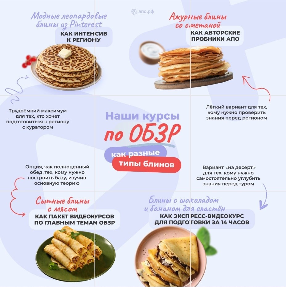 Региональный этап по этому предмету пройдёт уже 26–27 февраля, а значит, осталось меньше 10 дней, чтобы выучить или повторить всё самое важное. И раз уж самая активная неделя подготовки совпала с Масленицей, рассказываем о наших курсах, сопоставляя их с разными видами блинов. 🐆 Онлайн-интенсив — модный, как леопардовые блины из соцсетей Он стартовал только вчера, и вы ещё успеваете присоединиться! Вас ждут 12 онлайн-занятий по 90 минут с куратором для полноценной подготовки к региону. За оставшиеся 7 дней вы разберёте самые важные темы ОБЗР, напишете пробник и подробно его проанализируете. 🔗Присоединиться ✍️ Авторский пробник от АПО — лёгкая закуска, как тонкие блинчики со сметаной Если вы уверены в теории, но хотите больше практики, этот формат для вас. Задания составлены преподавателями кафедры ОБЗР АПО, поэтому они будут полезны даже тем, кто уже перерешал всё, что нашёл в интернете. 📍Пробник за 2025/26 год для 9 класса и для 10–11 классов 📍Пробник за 2024/25 год для 7–9 к