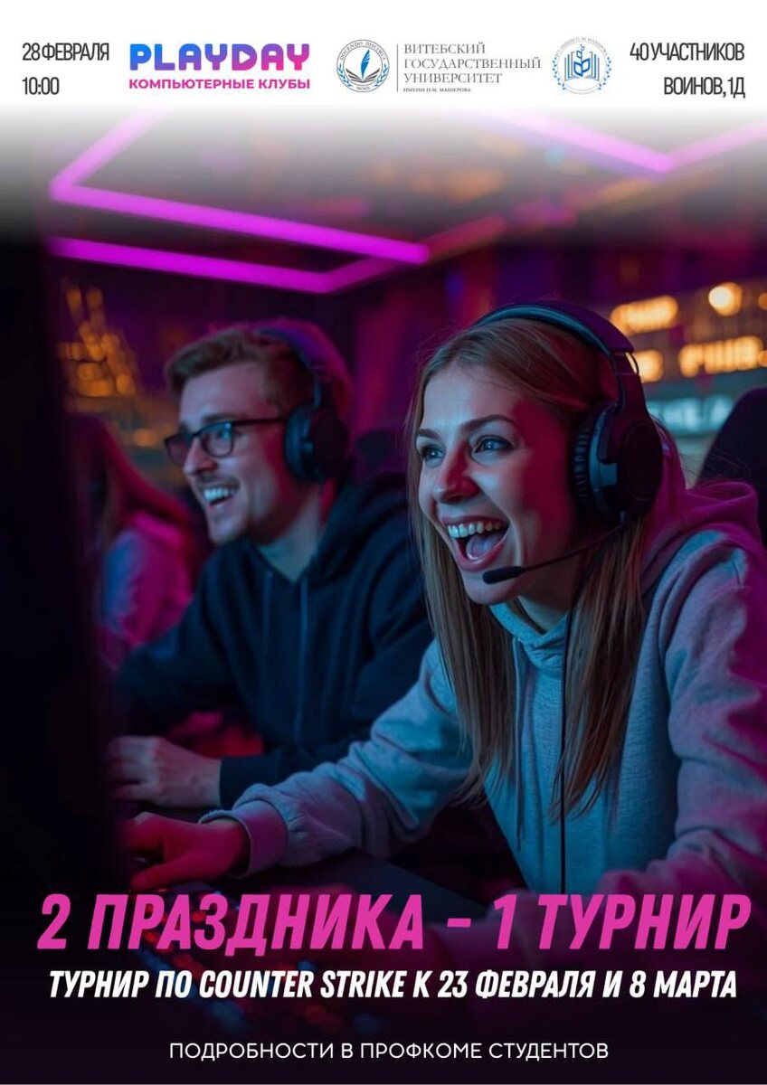 Отмечаем два праздника в одном ритме: приглашаем факультеты на турнир по Counter-Strike 2. Формат: играем строго 5х5. Восемь факультетских команд – никаких замен, только основной состав. Если на вашем факультете есть девушки, которые играют в CS, обязательно зовите их в команду. 🎮Заявки подаются профоргам факультетов (на каждом факультете есть человек, который отвечает за профсоюз). Мероприятие пройдет 28-го февраля (10:00) в компьютерном клубе Playday (Воинов-Интернационалистов, 1Д). #анонсы