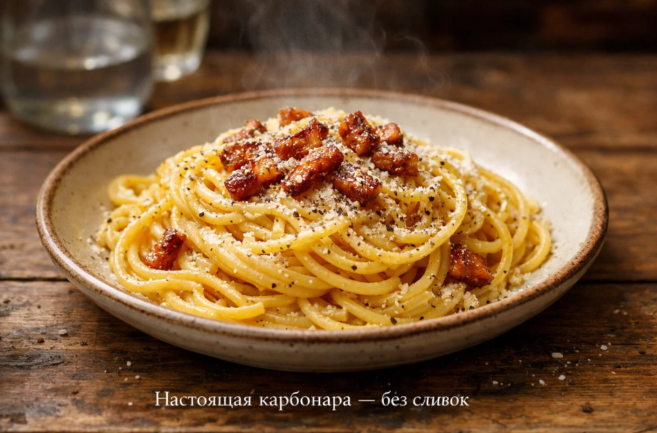 Когда я впервые попробовала настоящую римскую карбонару в маленькой траттории на узкой улочке Трастевере, мой мир перевернулся. То, что я готовила дома много лет и называла карбонарой, оказалось совершенно другим блюдом. Никаких сливок, никакого чеснока, никакого лука. Только паста, гуанчале, яйца, сыр пекорино романо, черный перец и немного воды от варки пасты. Звучит просто, но за этой простотой скрывается целая философия и техника, которую я осваивала несколько месяцев.