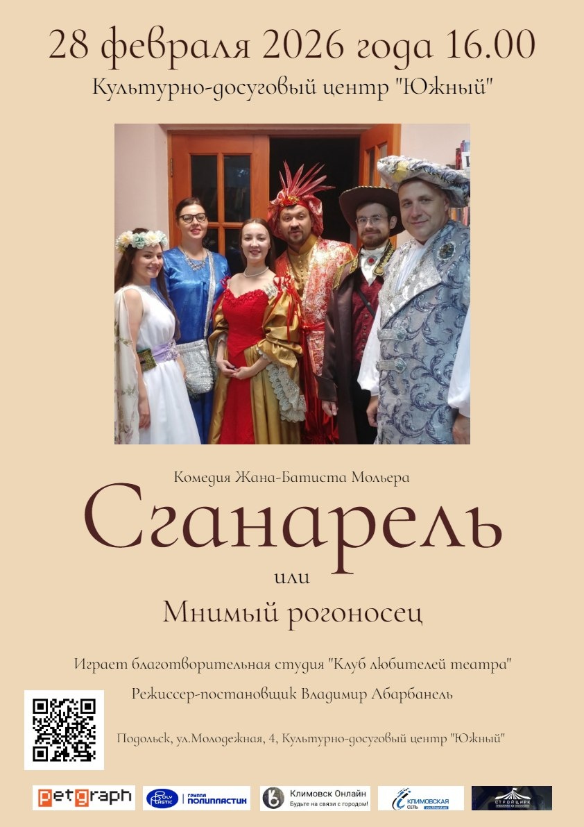 " В этой комедии Мольера есть все - страстная любовь, роковые заблуждения, ужасная ревность, смех и слезы. Играет благотворительная студия подольской библиотеки №26 "Клуб любителей театра". 🚫 Возраст: 12+ 📆 28.02.2026 🕛 16:00 🏢 КДЦ "Южный" 📍 г. Подольск, ул. Молодежная, 4 💰 Вход свободный❗️ ⭐Поддержать канал голосом 🍰Где поесть в Подольске ✅ Мероприятия Подольск https://dzen.ru/id/66ed500f7b5671493eca3fd6 http://vk.com/podolsk_events http://dzen.ru/podolsk_events