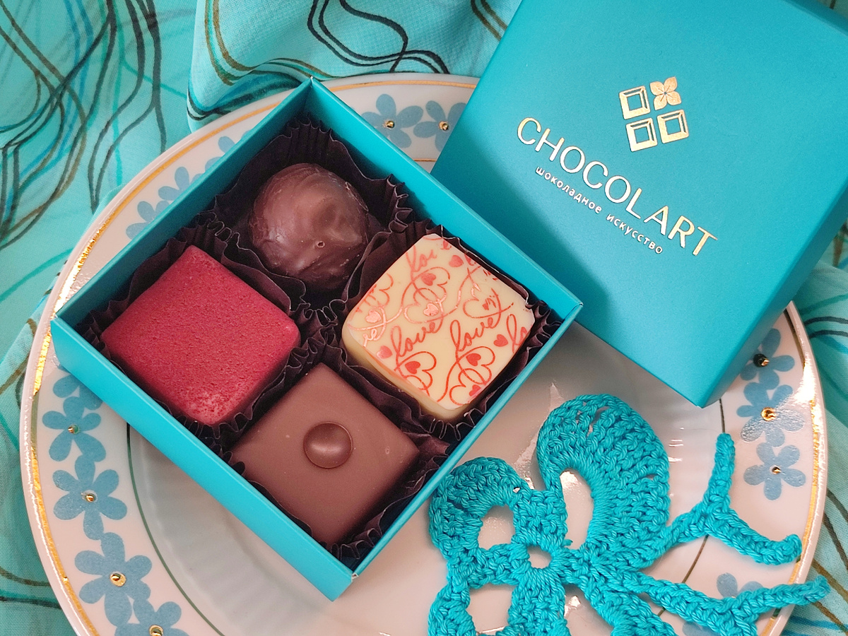 И вот она, нарядная на праздник к нам пришла коробочка с четырьмя конфетами! В прошлый раз был чемоданчик с конфетой, а тут прям сундук! Не унести 😂