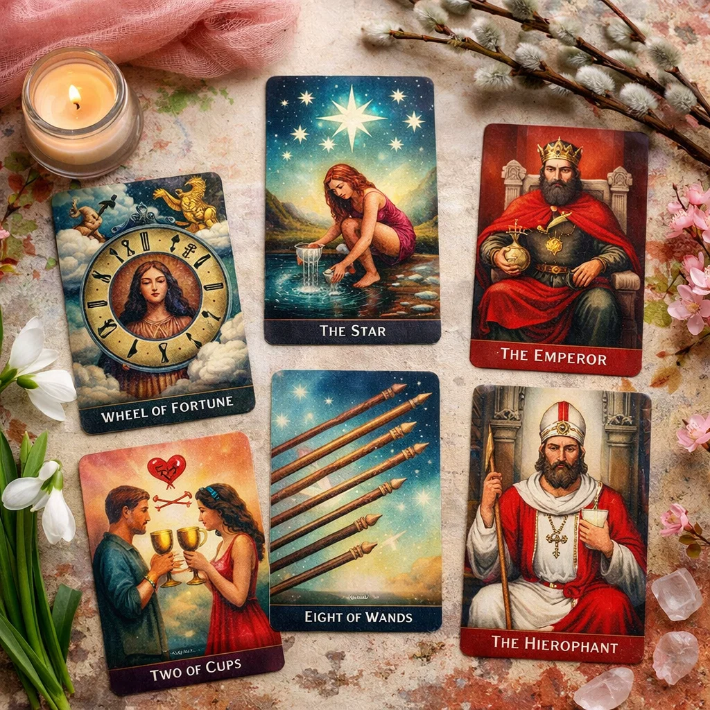 Спасибо каждому за лайки, подписки, комментарии, донаты! 🙏❤️ Вы вдохновляете меня создавать новые расклады и делиться важными посланиями. Пусть всё добро возвращается к вам сторицей! 💖 Девочки, сегодня расклад очень спокойный по тону, но мощный по сути. Без надрыва. Без «ах, срочно». Здесь всё про созревание. Про момент, когда совпадают время, готовность и человек. И вот это совпадение уже близко. На дне колоды лежит Колесо Фортуны. А это значит, что встреча не случайная. Не из серии «проходил мимо». Это пересечение линий судьбы. Вы могли идти параллельно годами. Не знать друг друга. Или знать, но не в том статусе. Колесо делает оборот — и траектории сходятся. И первое, что проявляется в раскладе, — Звезда. Это не страсть с первой секунды, не безумие. Это ощущение правильности. Как будто вы знали, что такой мужчина существует. И он вас узнает не только глазами, а ощущением. Там будет очень много спокойствия. Очень много «наконец-то». Это мужчина взрослой позиции. В раскладе стоит Имп
