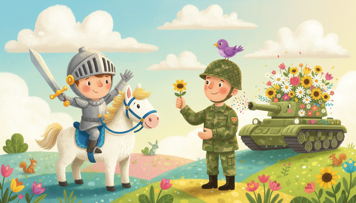 Для самых маленьких лучше использовать простые и добрые образы. Попробуйте запросы вроде: «милый плюшевый мишка в военной форме», «забавный мультяшный танк с большими глазами», «мальчик-супергерой защищает котенка», «добрый солдат улыбается». Используйте в промпте слова «милый», «добрый», «мультяшный», «простой рисунок», чтобы получить подходящий результат.