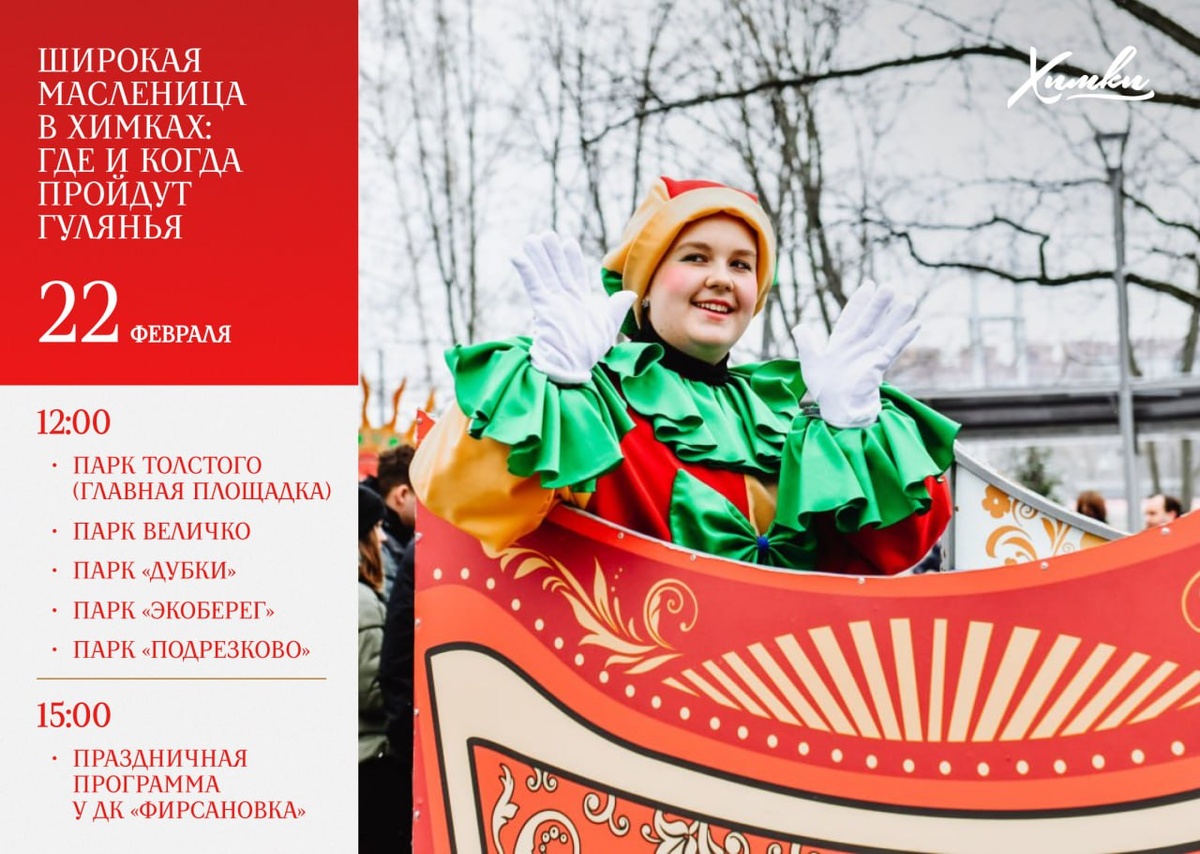 Во всех микрорайонах Химок 22 февраля пройдёт масленичные гулянья с хороводами, концертами и эстафетами. Согласно народному поверью, чем веселее проводишь зиму, тем теплее будет весна.