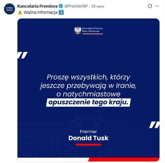 Премьер-министр Польши Дональд Туск выступил с экстренным обращением к гражданам, находящимся в Иране или планирующим туда поездку. Он потребовал немедленно покинуть страну, предупредив, что уже через несколько десятков часов эвакуация станет невозможной. "Я не хочу никого пугать, но все мы знаем, о чём я говорю. Возможность ожесточённого конфликта вполне реальна", – заявил Туск, напрямую связав угрозу с вероятным ударом США по ИРИ. Заявление прозвучало на фоне сообщений о том, что Дональд Трамп обсуждает сроки военной операции против Тегерана. Удар может быть нанесён уже в ближайшие выходные. Окончательное решение пока не принято, но польский премьер, очевидно, действует на основании разведданных. Очевидно, что США готовятся к силовому сценарию, а европейские союзники в спешке вывозят своих граждан. Предполагаю, что Трамп начнёт свою войну в годовщину начала СВО, ранним февральском утром. С 20 по 25 февраля будут самые напряжённые дни.