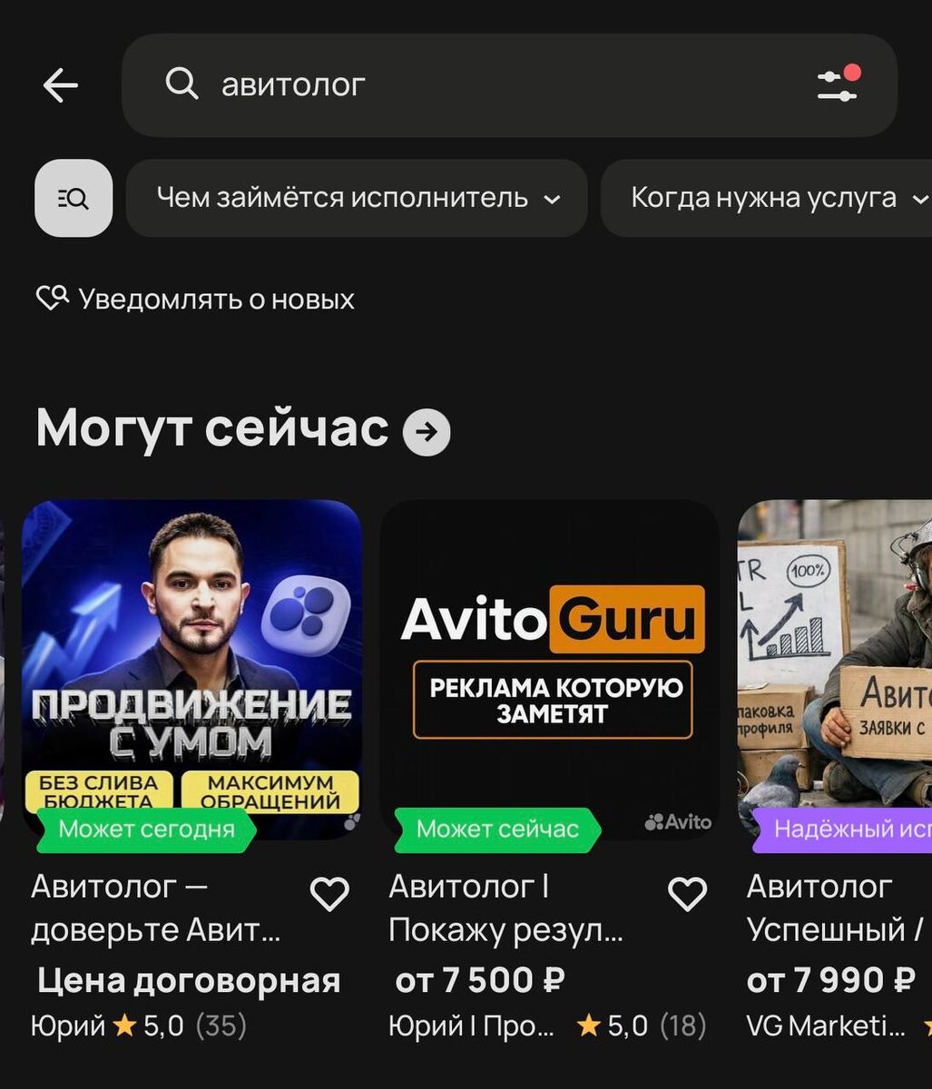 » С момента появления данного фильтра, я уже не раз говорил о его значимости. В этом посте приводил пример: насколько отличается уровень конкуренции с фильтром и без(спойлер: зачастую в 10 раз!). А недавно Авито решил еще больше выделить исполнителей, которые «могут сейчас») На мой взгляд, отдельный блок в выдаче - это сильно! Когда-то давно места в подобных блоках стоили денег. Кто помнит «VIP-объявления»?) Олды, ставьте🔥 Как вам такое решение?) Делитесь своим мнением в комментариях👇