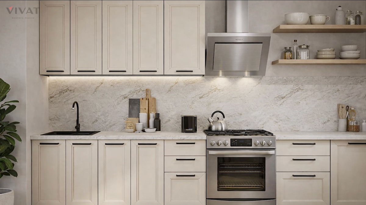 Хотите узнать, какие кухни будут в моде в 2026 году? Сейчас мы поделимся тем, что вдохновит вас на интерьер мечты и поможет выбрать кухню, которая будет актуальной долгие годы — 3 главных тренда этого года в цветах, текстурах и компоновки кухни. Главная идея 2026 года — спокойный нейтральный фон. Мягкие, молочные и бежевые оттенки. Эти цвета становятся основой интерьера, создавая ощущение чистоты, свежести и спокойствия. Каждый год Pantone задает тон. Например, в 2025 году цветом года был теплый насыщенный коричневый оттенок Mocha Mousse, символизирующий уют и комфорт. Он появился и в интерьерах, и в моде — его было видно буквально во всех коллекциях одежды. Но в 2026 году тренды возвращают нас к базе — чистым природным тонам. Цвет года Cloud Dancer с забавным переводом «Облачный танцор». Нежный спокойный белый, который символизирует ясность и пространство в эпоху информационного шума. Этот оттенок прекрасно работает как база, визуально расширяет помещение и развязывает руки для творче