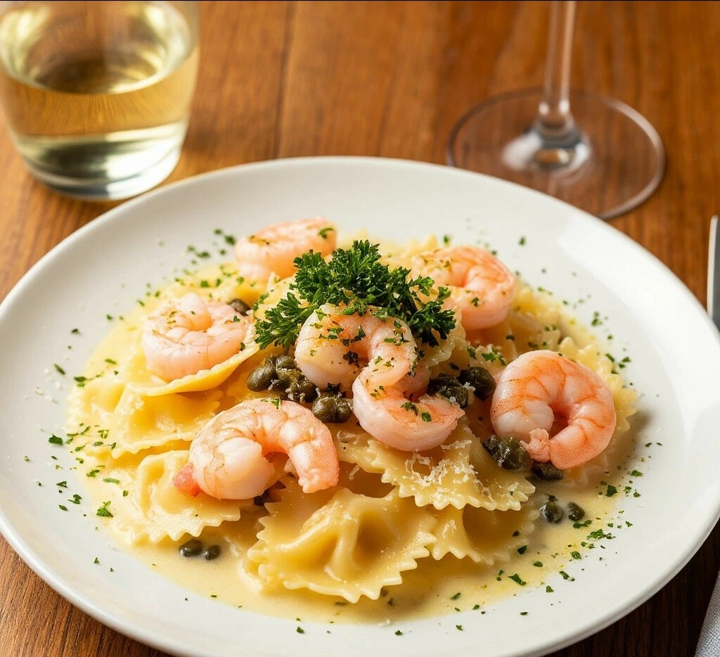 ПОЧЕМУ ЭТО ШЕДЕВР? 🎨 Этоидеальная паста для романтического ужина или просто для себя, любимого. Соус — нежный, сливочный, с лёгкой кислинкой лимона и пикантными каперсами. Креветки добавляют белок и морскую ноту. А бантики — само очарование! 🇮🇹