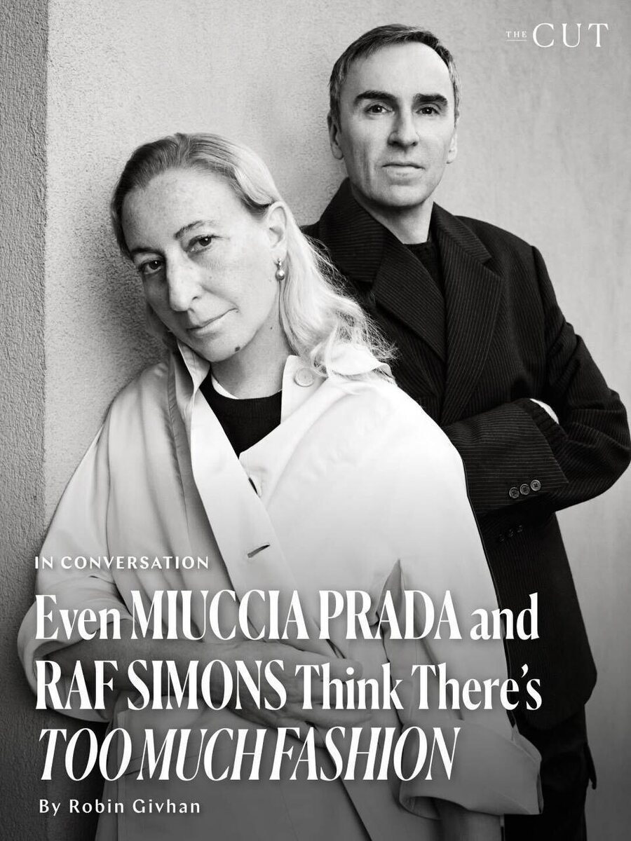 Ниже цитаты, которые я выделила про состояние fashion сейчас. В основном они крутятся вокруг того, что мода стала одинаковой. 💬Раф: Мода — это новая поп-культура. Раньше это было что-то маленькое и эксцентричное. Когда я рос, я хотел быть другим. Теперь все хотят быть одинаковыми, поэтому наблюдается групповое поведение, которое, как мне кажется, не соответствует природе настоящей моды. Слишком много моды. Слишком много продукции. Слишком много презентаций. Слишком много демонстрации. Опасность в том, что мода перестанет быть столь желанной. Такова природа человека — то, к чему у тебя есть легкий доступ, тебе не нужно. 💬Миучча: Мир моды критикуют за то, что там все одно и то же. Любой, кто что-то делает, через два месяца получает один и тот же товар. Все отчаянно пытаются продать, потому что компании большие, и на вас лежит большая ответственность перед вашими сотрудниками. В последнее время я счастливее, потому что вижу, что мода важна для людей. Но я всегда говорю, что она ва